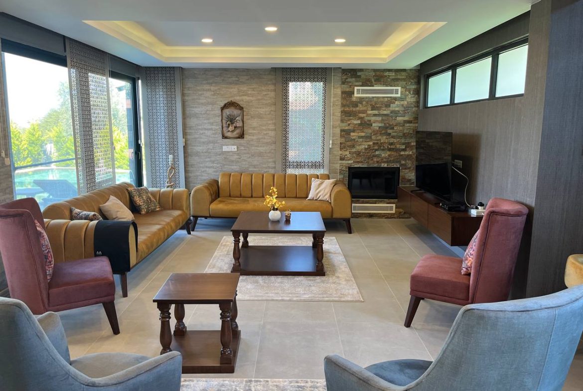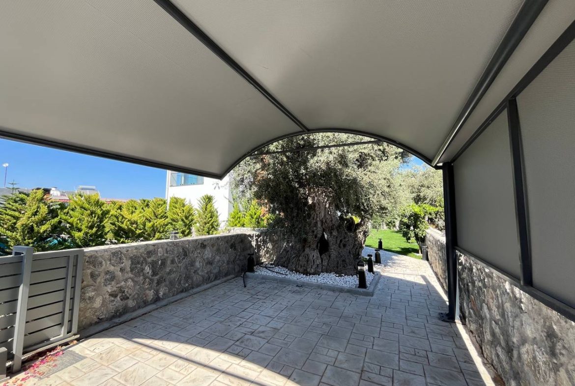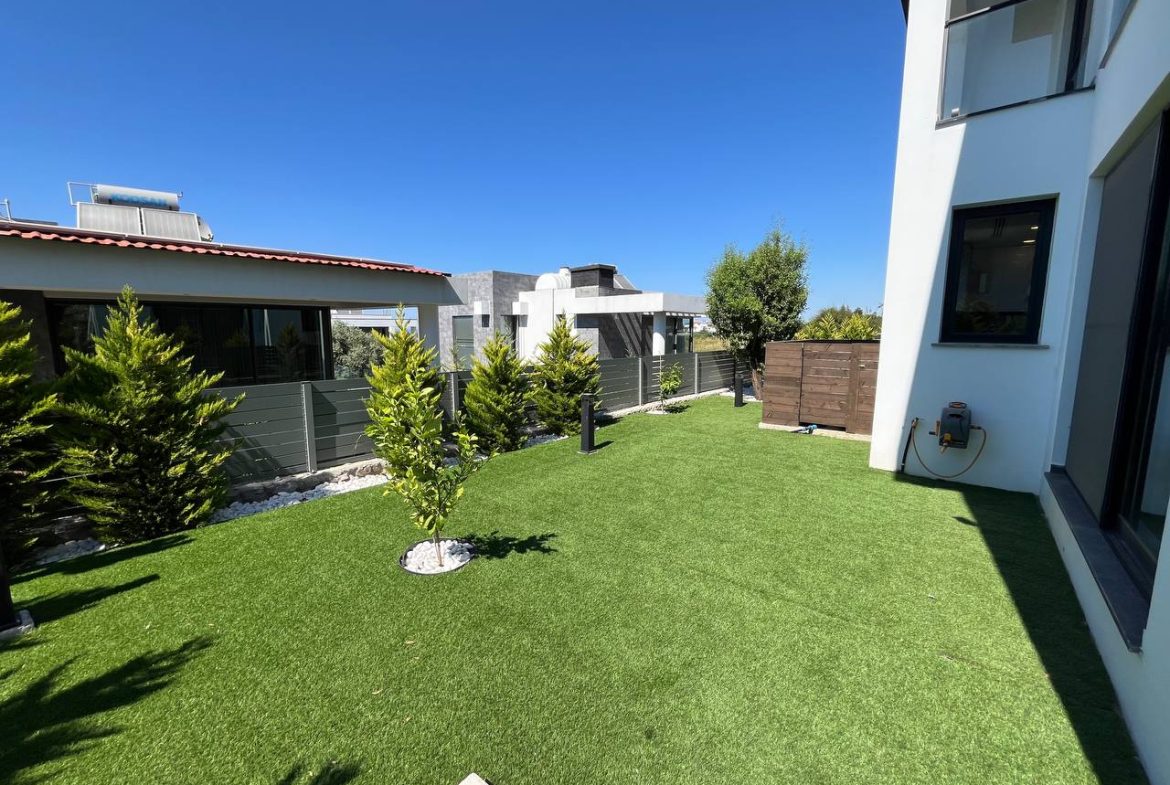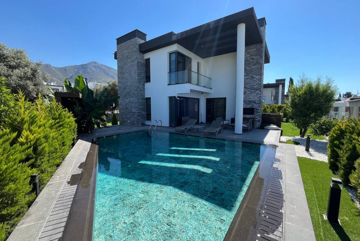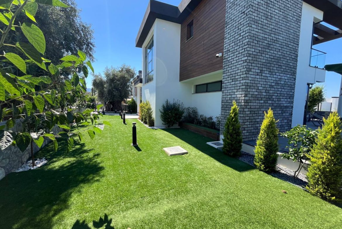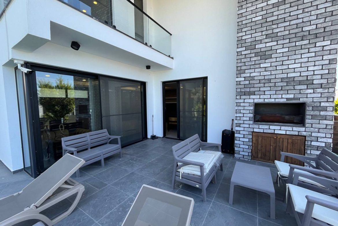 Located in the Ozanköy region of Northern Cyprus, this 4+1 duplex villa offers easy access to the main road, amenities, and the center of Girne. Situated on a 600 m² plot with a 250 m² closed area, the villa features a total of four bedrooms, two of which have en-suite bathrooms. The master bedroom also includes a walk-in closet. There are a total of 3 bathrooms and a guest toilet on the ground floor. The villa is furnished with fully equipped luxury furniture, and the white goods are of the Bosch brand. The villa has a VRF system for heating and cooling. It boasts high-quality construction and a large kitchen with ample cabinet space. Additionally, there is a fireplace in the living room and a small kitchenette/pantry on the upper floor. The two bedrooms on the upper floor have large balconies with sea views. The garden includes a swimming pool, an outdoor shower, and a barbecue area. The garden is fully landscaped with trees and artificial grass, and features an irrigation system to facilitate maintenance. There is a private covered parking area equipped with an electric gate. The villa is being sold with a Turkish title deed.