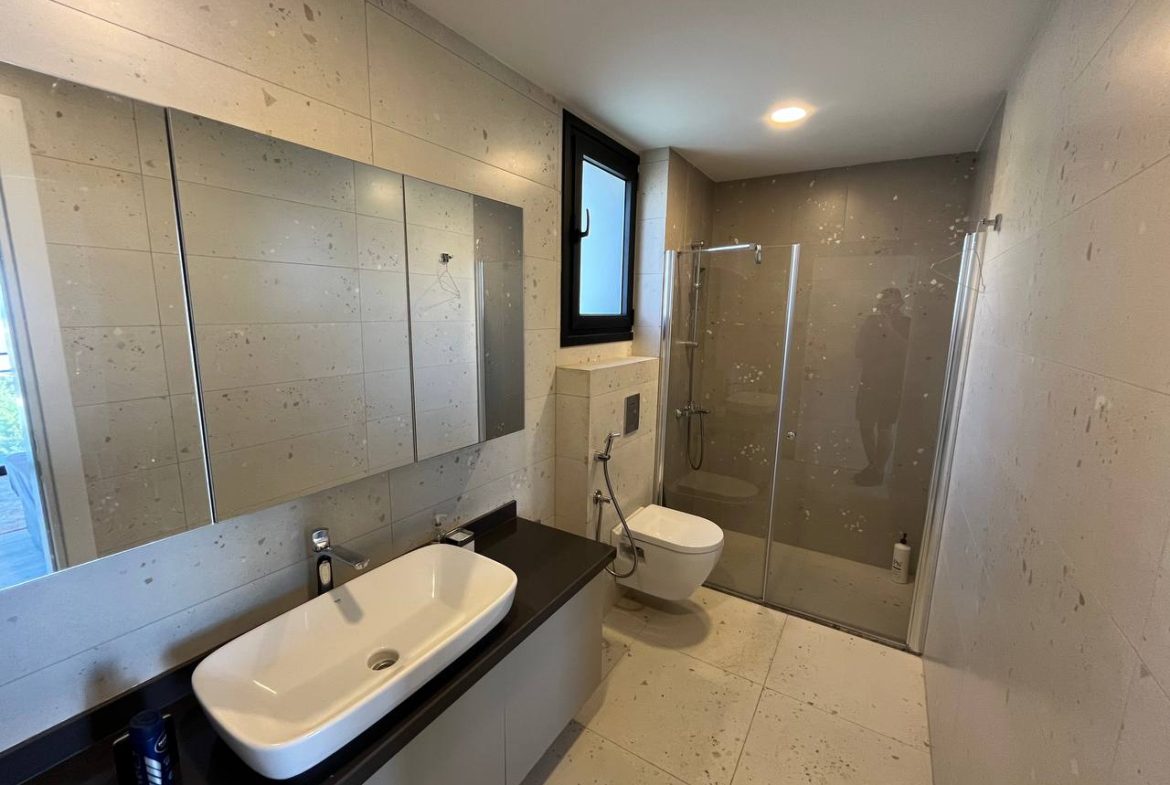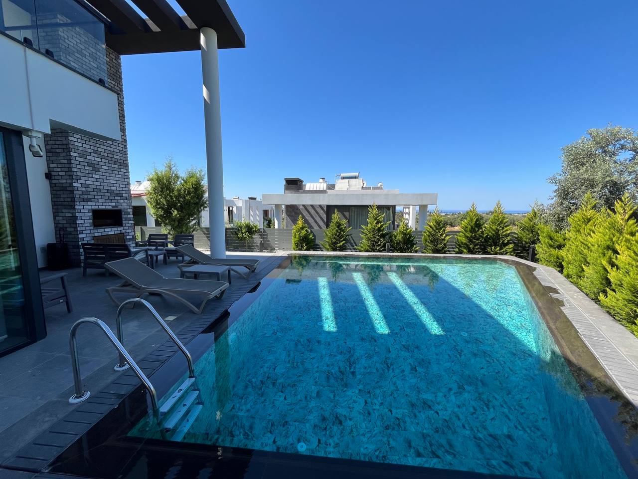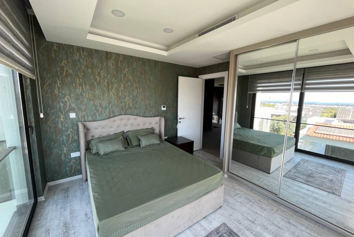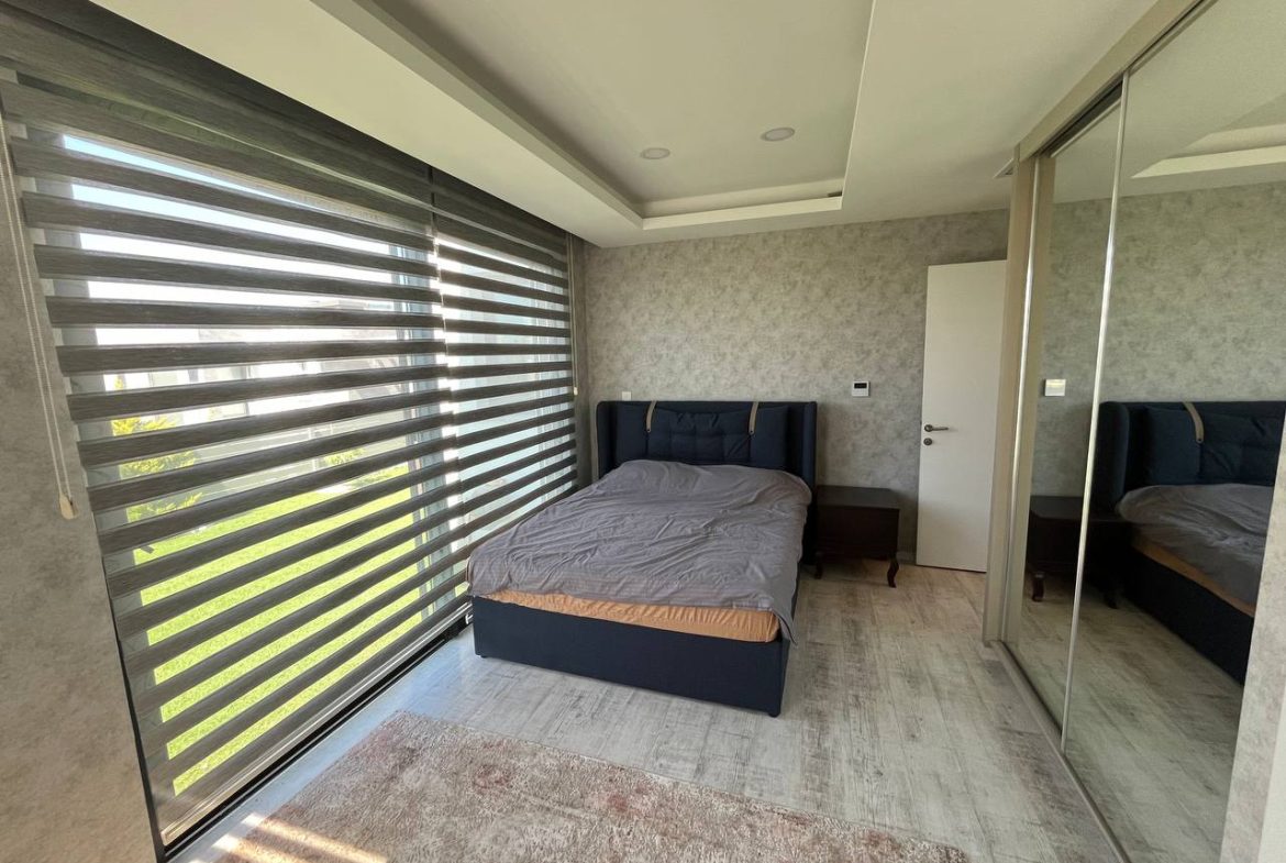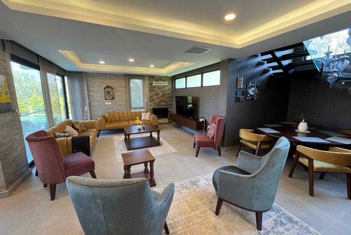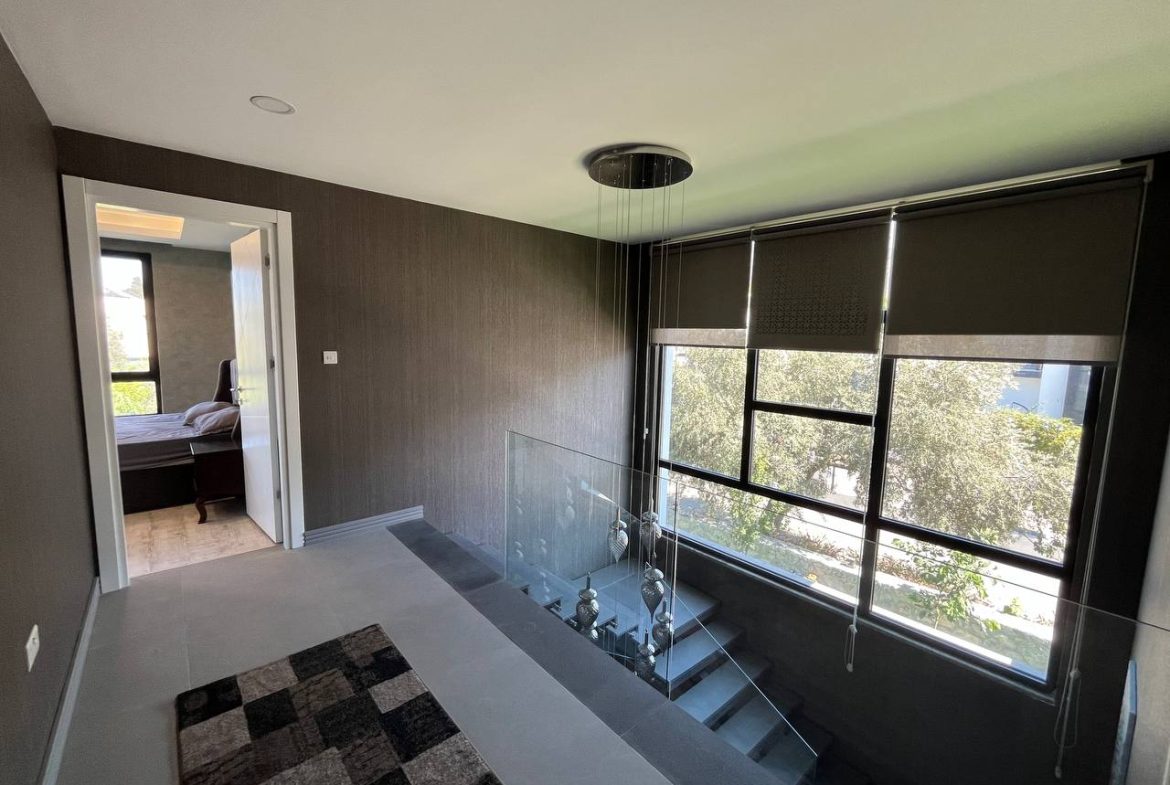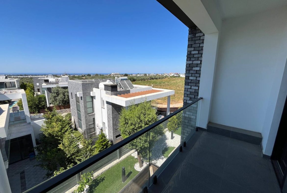 Located in the Ozanköy region of Northern Cyprus, this 4+1 duplex villa offers easy access to the main road, amenities, and the center of Girne. Situated on a 600 m² plot with a 250 m² closed area, the villa features a total of four bedrooms, two of which have en-suite bathrooms. The master bedroom also includes a walk-in closet. There are a total of 3 bathrooms and a guest toilet on the ground floor. The villa is furnished with fully equipped luxury furniture, and the white goods are of the Bosch brand. The villa has a VRF system for heating and cooling. It boasts high-quality construction and a large kitchen with ample cabinet space. Additionally, there is a fireplace in the living room and a small kitchenette/pantry on the upper floor. The two bedrooms on the upper floor have large balconies with sea views. The garden includes a swimming pool, an outdoor shower, and a barbecue area. The garden is fully landscaped with trees and artificial grass, and features an irrigation system to facilitate maintenance. There is a private covered parking area equipped with an electric gate. The villa is being sold with a Turkish title deed.