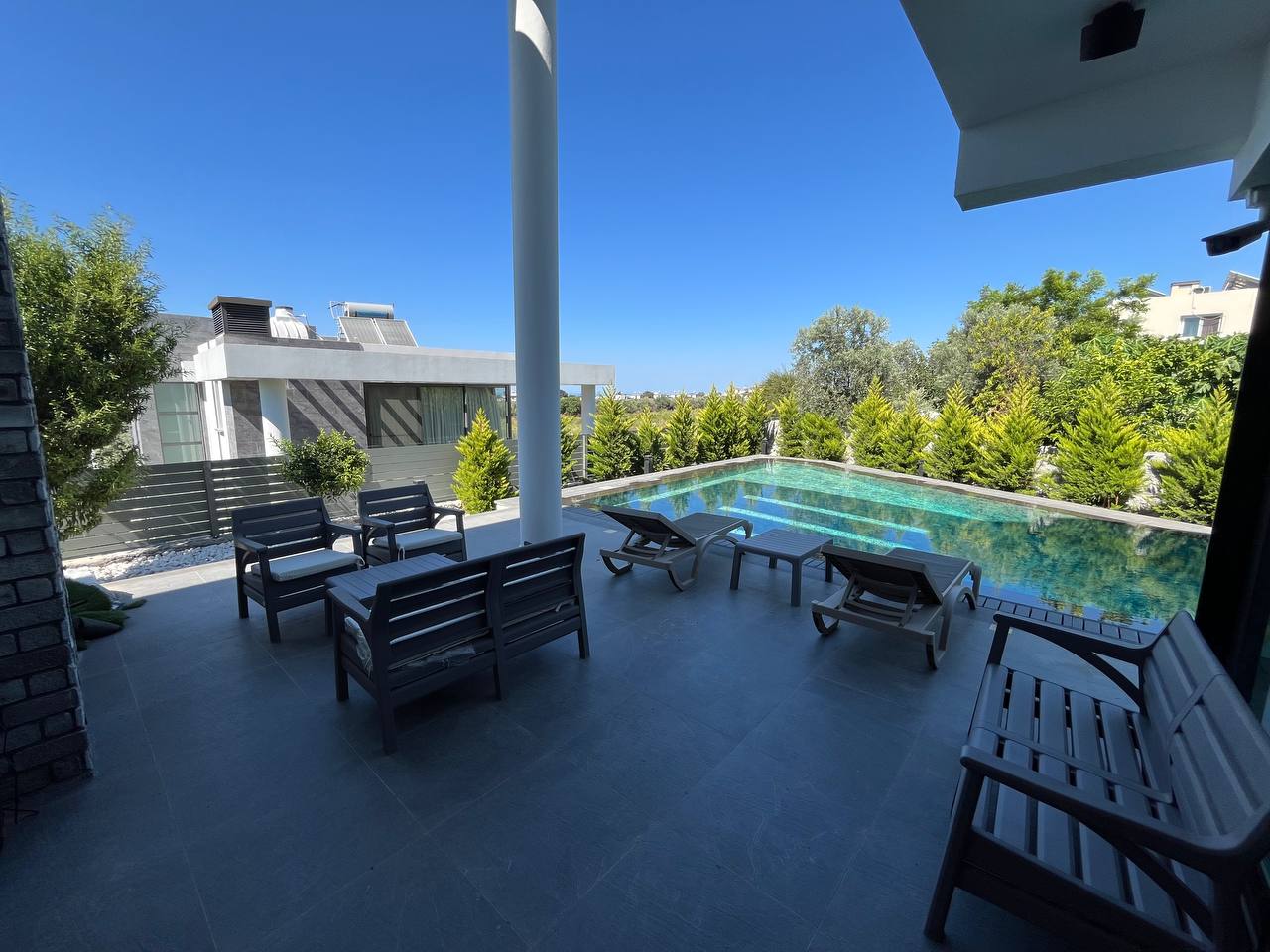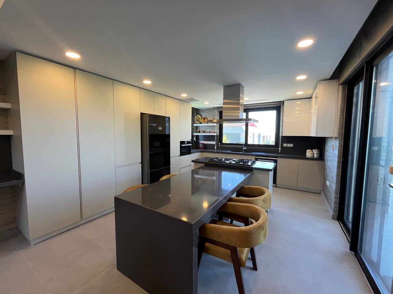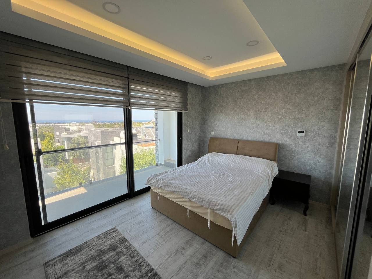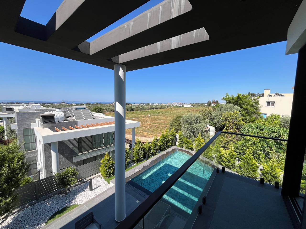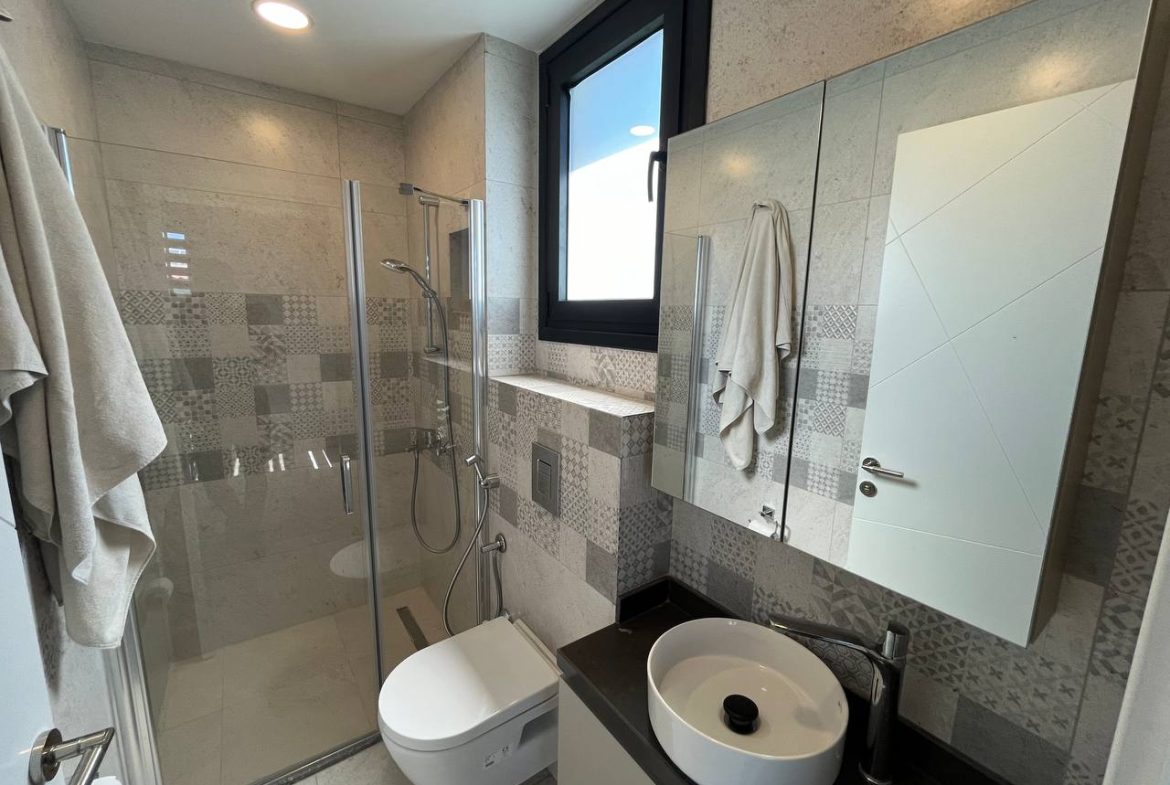 Located in the Ozanköy region of Northern Cyprus, this 4+1 duplex villa offers easy access to the main road, amenities, and the center of Girne. Situated on a 600 m² plot with a 250 m² closed area, the villa features a total of four bedrooms, two of which have en-suite bathrooms. The master bedroom also includes a walk-in closet. There are a total of 3 bathrooms and a guest toilet on the ground floor. The villa is furnished with fully equipped luxury furniture, and the white goods are of the Bosch brand. The villa has a VRF system for heating and cooling. It boasts high-quality construction and a large kitchen with ample cabinet space. Additionally, there is a fireplace in the living room and a small kitchenette/pantry on the upper floor. The two bedrooms on the upper floor have large balconies with sea views. The garden includes a swimming pool, an outdoor shower, and a barbecue area. The garden is fully landscaped with trees and artificial grass, and features an irrigation system to facilitate maintenance. There is a private covered parking area equipped with an electric gate. The villa is being sold with a Turkish title deed.