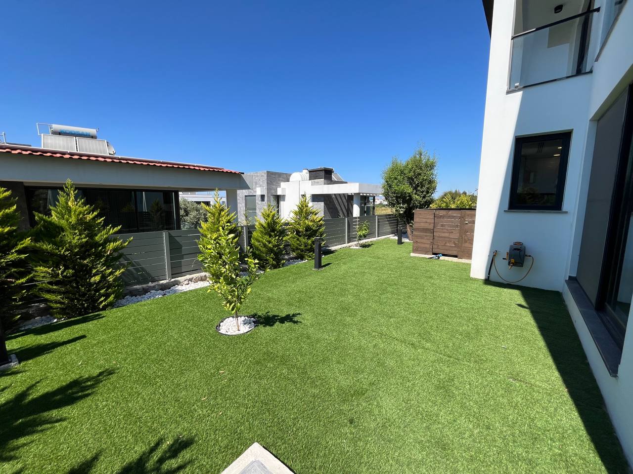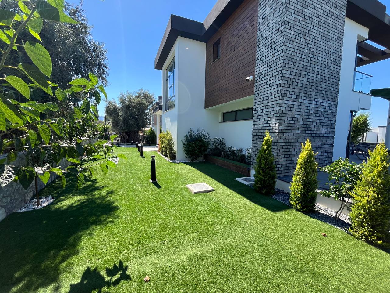 Landscaped garden with trees and artificial grass